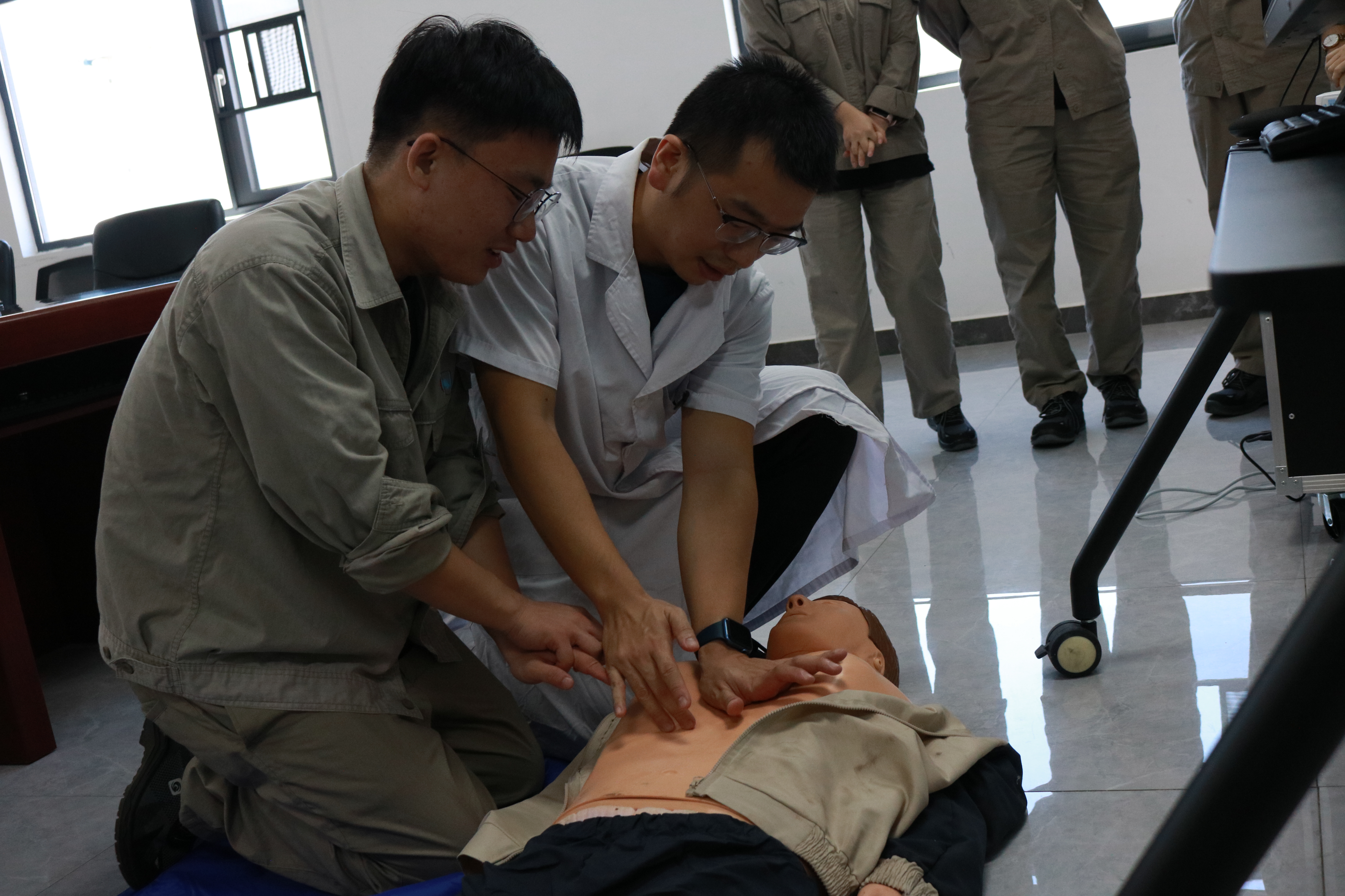 理論講解結束后,進入模擬操作和現場指導環節。陳宏主任用模擬人演示了完整的CPR流程,隨后,員工們進行實操練習,陳宏主任悉心指導每位員工的操作,對不規范的動作進行耐心的示范和糾正,員工及時規范急救動作,反復操作,直到掌握正確方法。